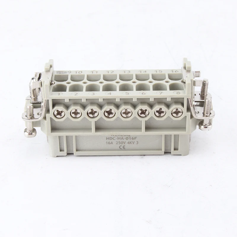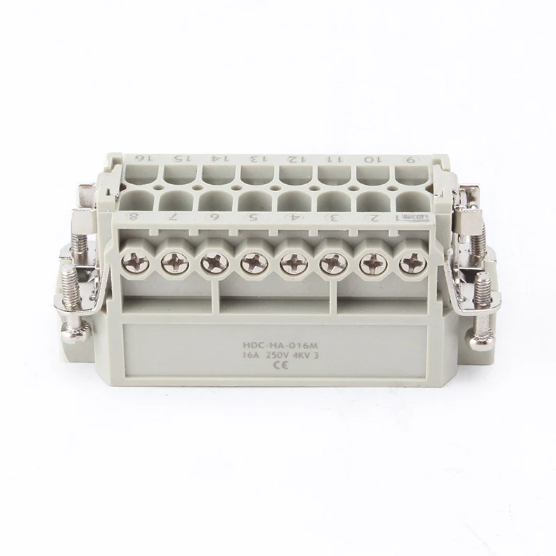 16A 10 பின் இன்செர்ட் ஹெவி டியூட்டி கனெக்டர்கள் பெண் மற்றும் ஆண் மந்த பாகங்களாகும். HA-016-M மற்றும் HA-016-F ஆகியவை ஆண் மற்றும் பெண் பாகங்கள், அவை ஒரு தொகுப்பாக ஒன்றுக்கொன்று பொருந்துகின்றன. அவர்கள் H16A இன் அலுமினிய வீடுகளுடன் இணைந்து பணியாற்றுகின்றனர். செருகும் கூறுகள் மற்றும் வெளிப்புற வீடுகள் இணைந்து ஒரு முழுமையான இணைப்பான் தயாரிப்பை உருவாக்குகின்றன. அவை பிசி ஷெல் மற்றும் வெள்ளி முலாம் பூசப்பட்ட பித்தளை ஊசிகளால் செய்யப்பட்டவை. வெள்ளி முலாம் பூசப்பட்ட ஊசிகள் அதை நன்கு மின்சார இணைப்புகளை உருவாக்குகின்றன.