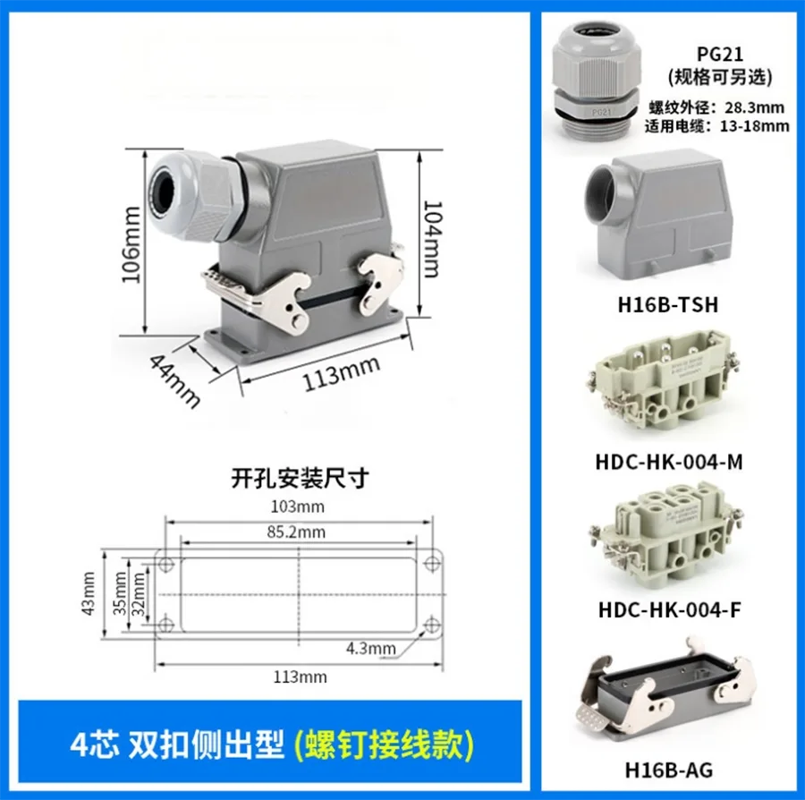 HK-004/0-M HK ஹெவி டியூட்டி இணைப்பிகள் 80A மின்னோட்டத்தின் கீழ் வேலை செய்கின்றன. கம்பிகளுடன் தொடர்பு கொள்ள இது 4 ஊசிகளாகும். இது வெவ்வேறு வேலை நிலைமைகளுக்கு வழங்குகிறது, மேலும் தானியங்கி தொழில்கள் மற்றும் இயந்திரத்தின் வயரிங் இணைப்பு வகைகளில் பிரபலமானது.